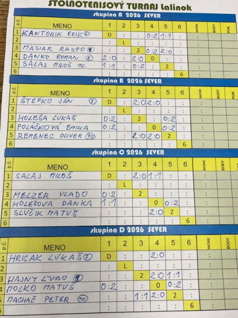 13. ročník stolnotenisového turnaja, ktorý sa konal 3. januára 2025 v Divinke-Lalinku, priniesol hneď na úvod nového roka kvalitné zápasy a príjemnú športovú atmosféru. Na podujatí sa zúčastnili hráči domáceho klubu, ako aj z klubov Divina-Lúky, Rosina, Lietavská Lúčka, Terchová a Rovaa Žilina, dovedna vyše 30 hráčov, čím sa turnaj stal zaujímavým regionálnym stretnutím viacerých stolnotenisových komunít.